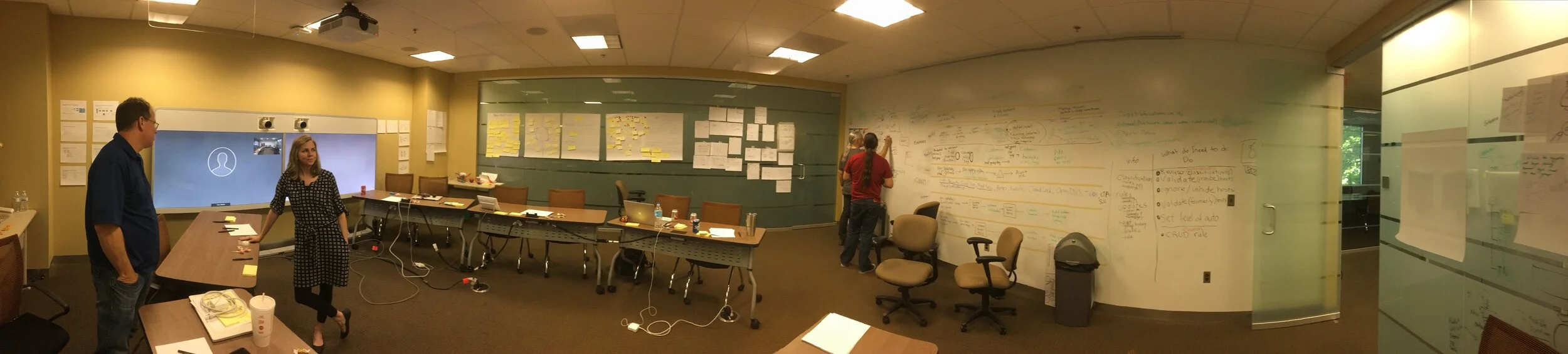 Day three of our first Google Design Sprint. A dedicated room to capture our sprint exercises including research and design concepts. From Left to Right: Phillip McDonald - Senior Director of Engineering, Diana Horn - UX Research & Innovation Lead, UX Designer Alex Filacchione - Sr. UX Designer/Strategist, Zane Bond - Sr Product Manager and Security SME.